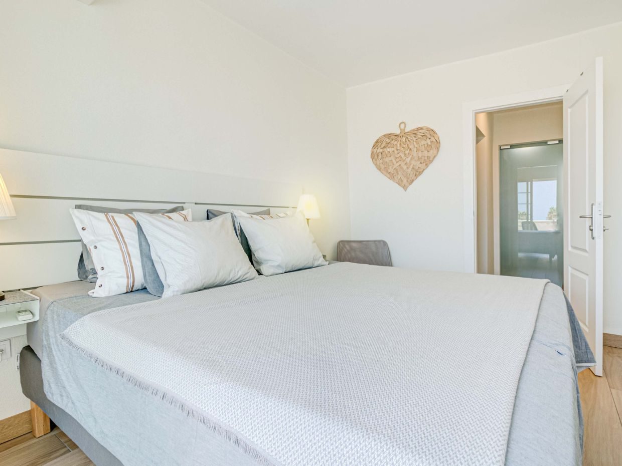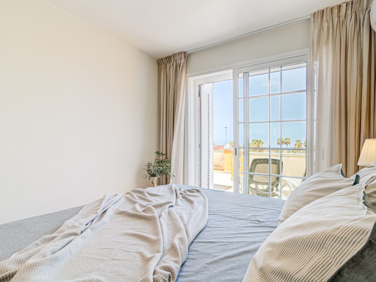 El apartamento ofrece un salón amplio y luminoso con acceso directo a una terraza privada, perfecta para disfrutar del clima durante todo el año, con agradables vistas a la piscina y una ligera panorámica al mar. El dormitorio principal cuenta con vestidor, un elemento poco habitual que aporta funcionalidad y confort. El baño ha sido reformado con un estilo moderno que armoniza con el conjunto de la vivienda.