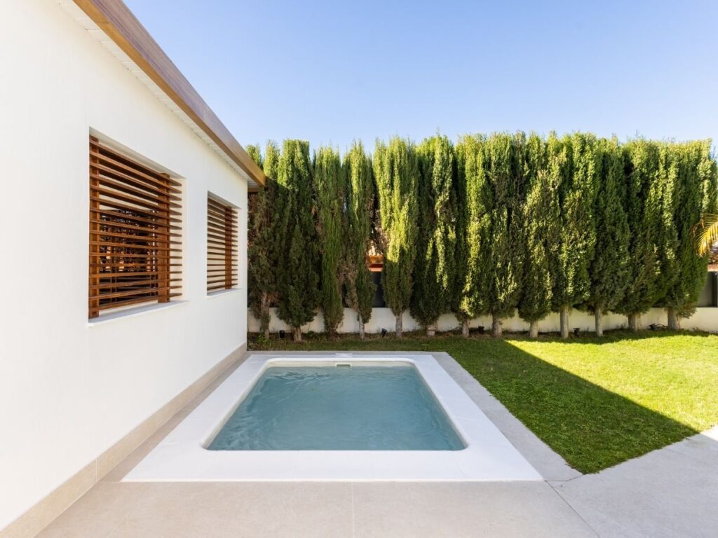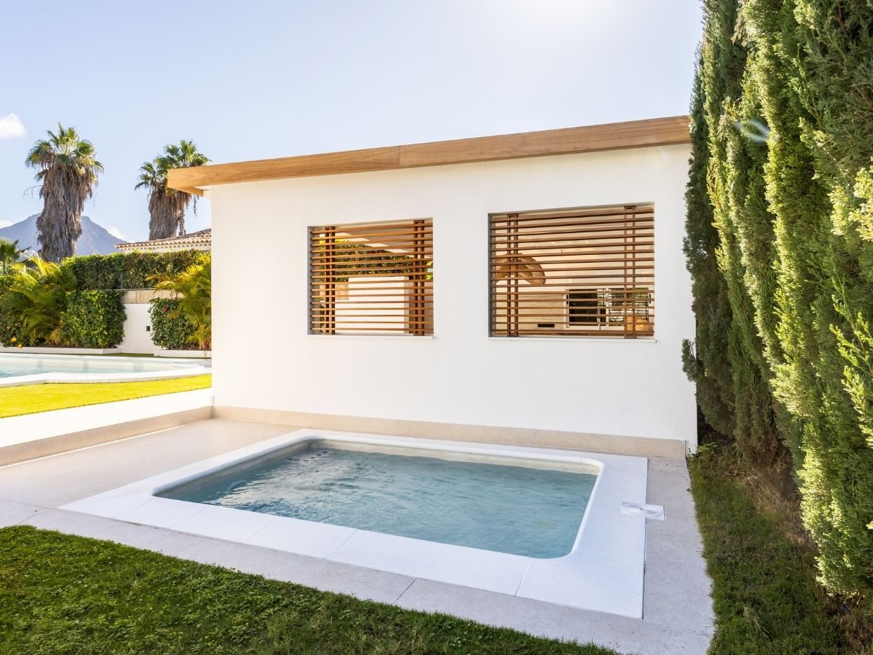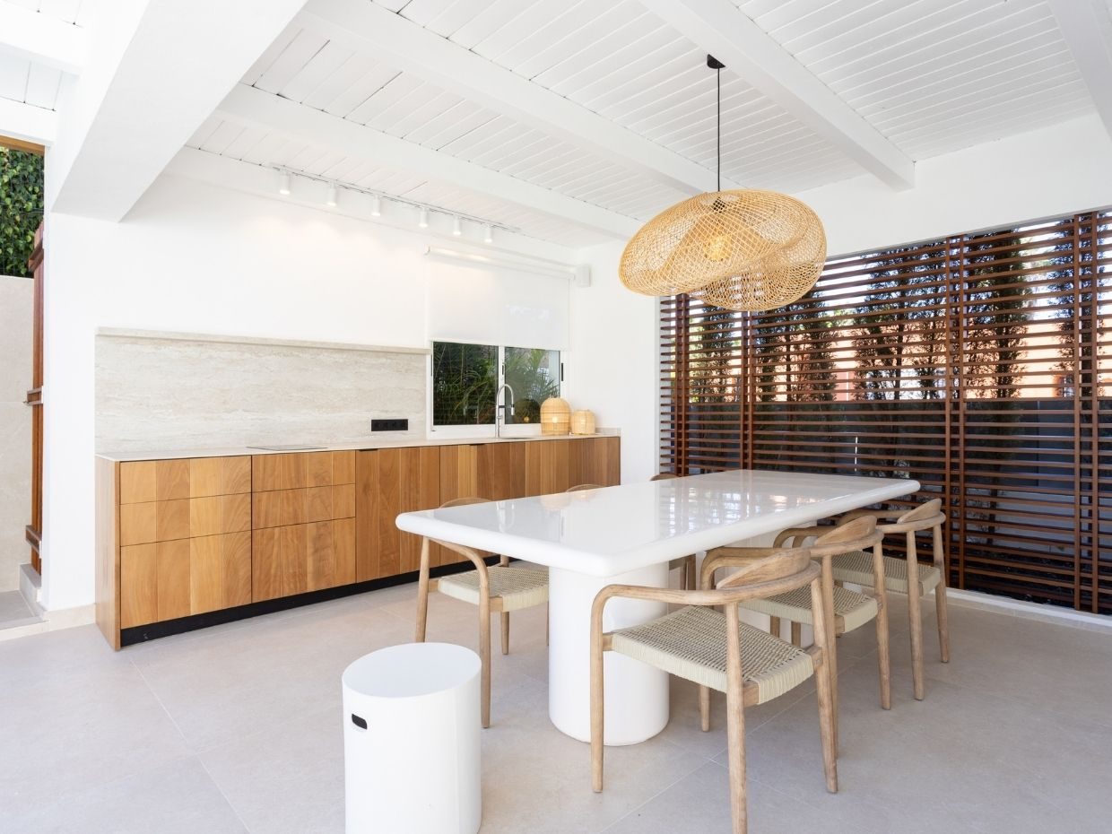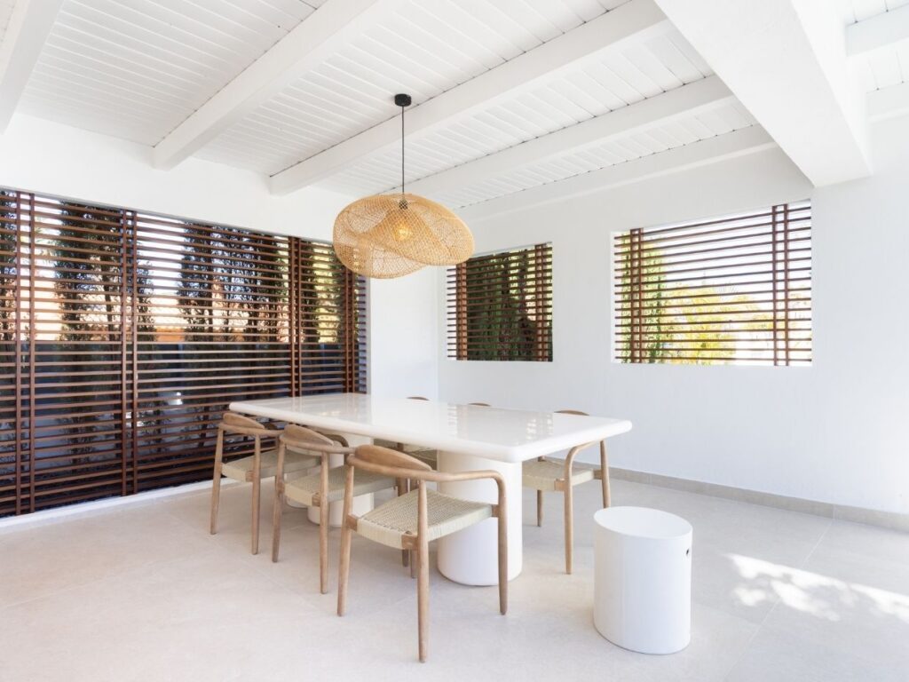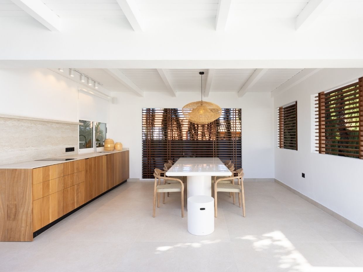 En el exterior, la villa despliega su auténtico encanto: dos piscinas privadas (una para adultos y otra infantil), cocina y comedor exteriores, ducha al aire libre y zonas ajardinadas que crean un entorno de privacidad y relax absoluto.