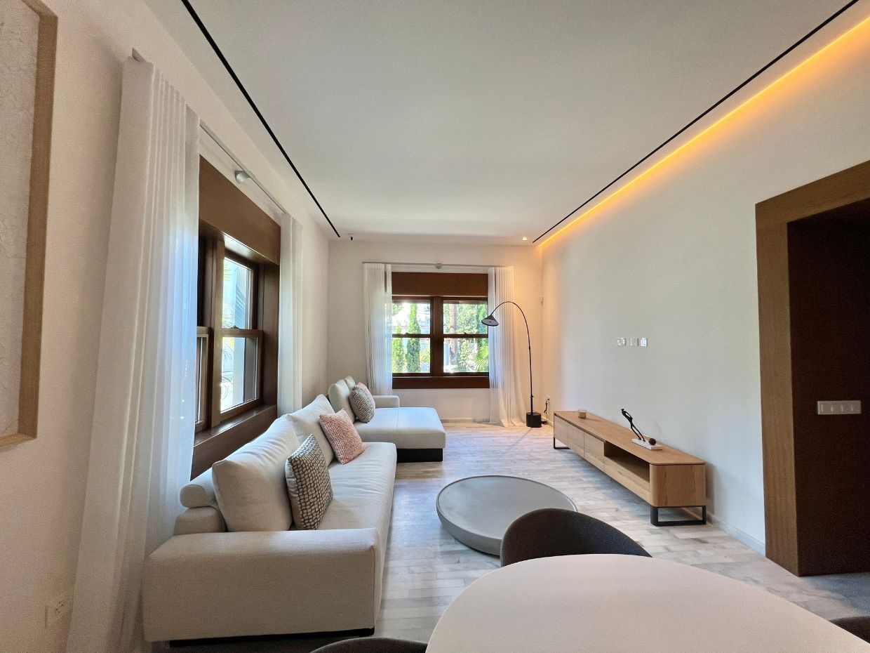 Un elegante recibidor da la bienvenida y conecta con dos salones amplios y un baño completo. Además, cuenta con un patio interior presidido por un majestuoso olivo que aporta serenidad y un toque mediterráneo.