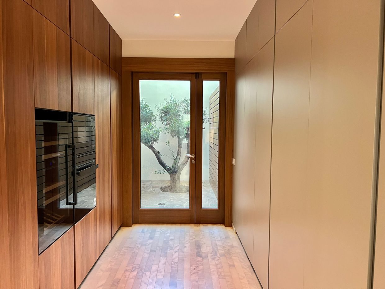 En esta planta también encontramos una impresionante cocina de diseño, pensada como el corazón de la vivienda. Con mobiliario a medida, amplios armarios y una iluminación estudiada que combina luz natural e indirecta, ofrece un espacio funcional y acogedor. Desde aquí se accede al salón principal y a una terraza rodeada de vegetación, perfecta para disfrutar del aire libre con total privacidad.